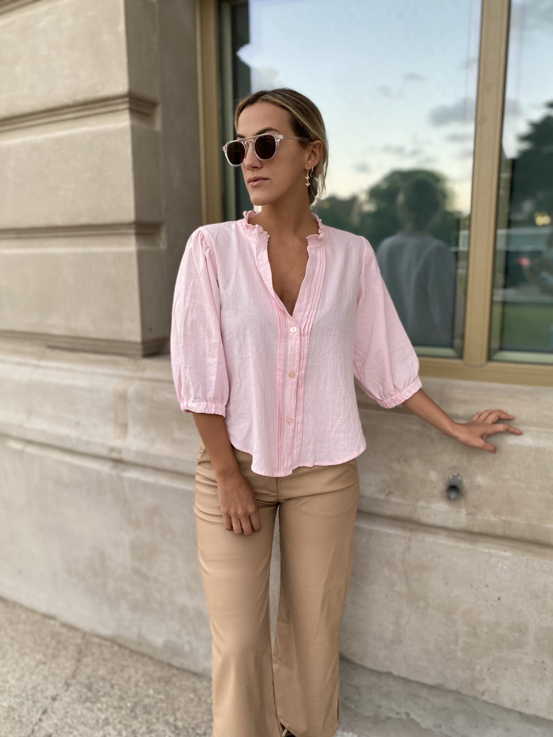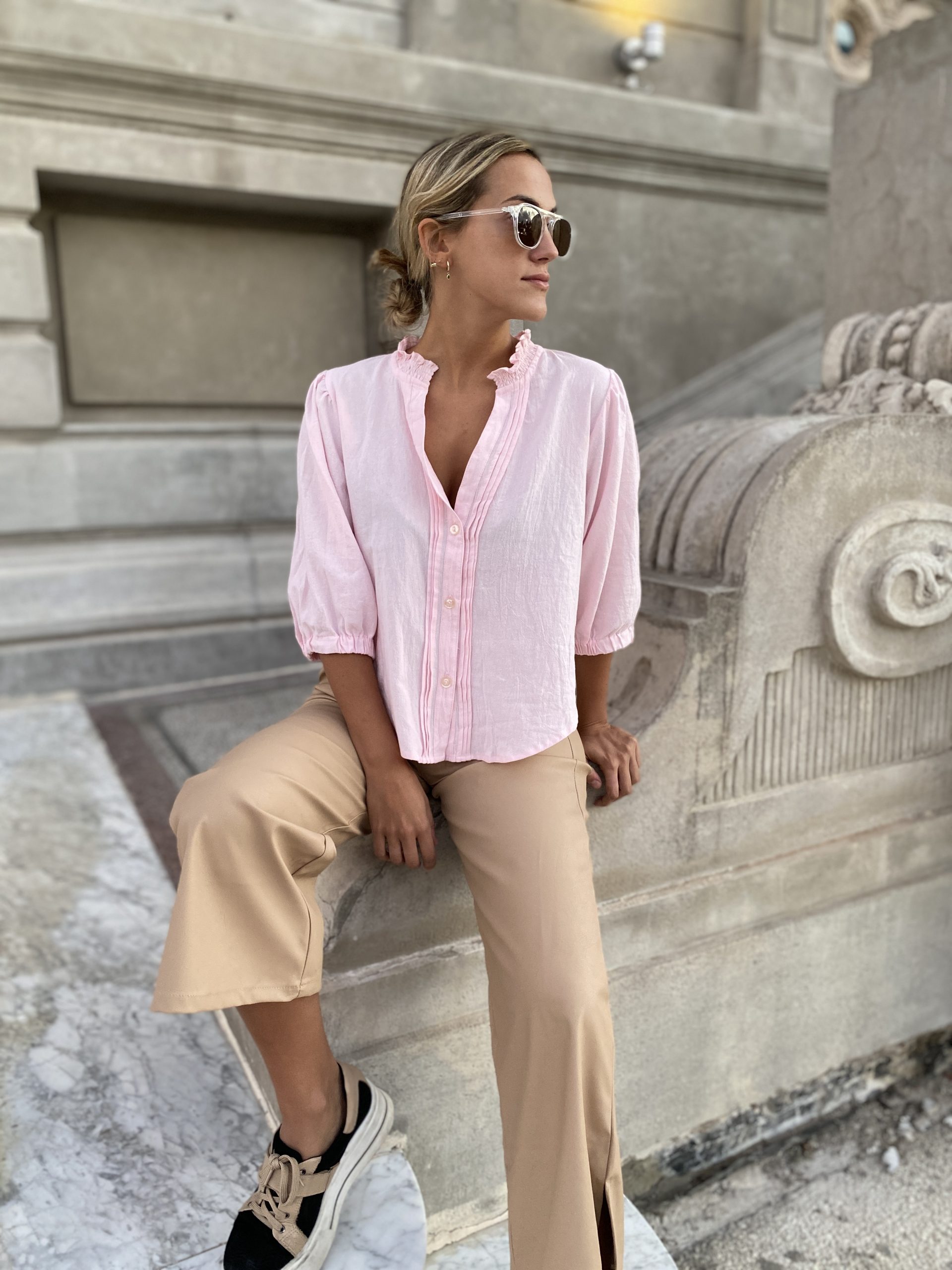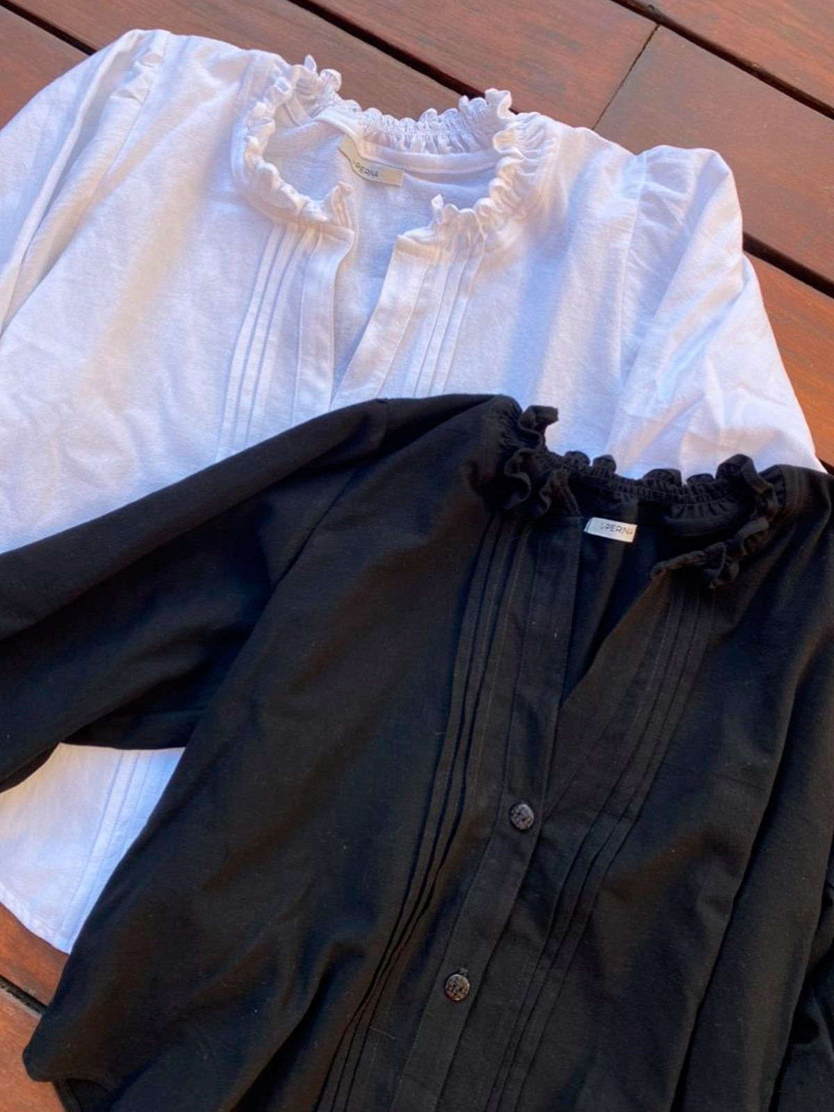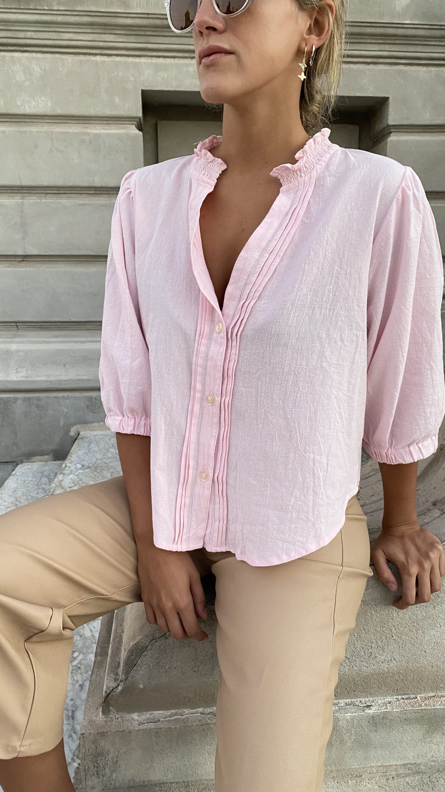 Camisa romántica, detalles en todos lados, con botones. En color rosa, negro y blanco.