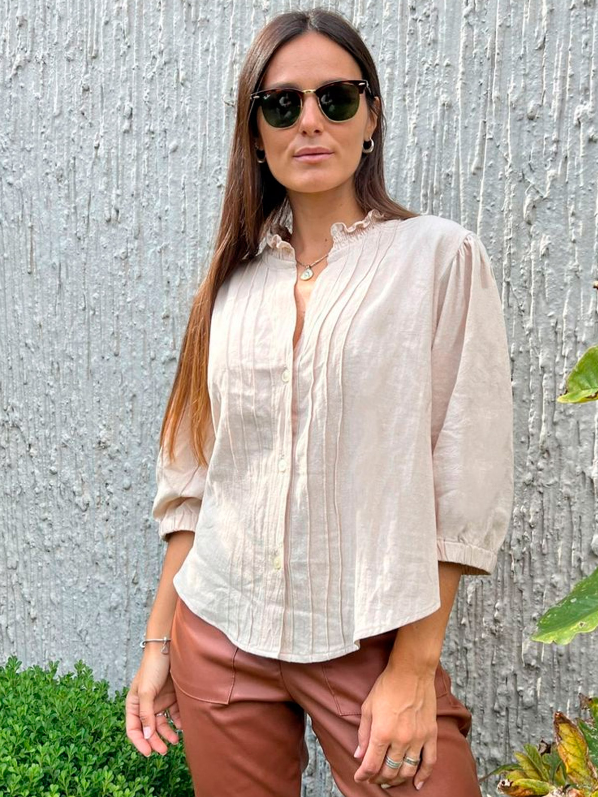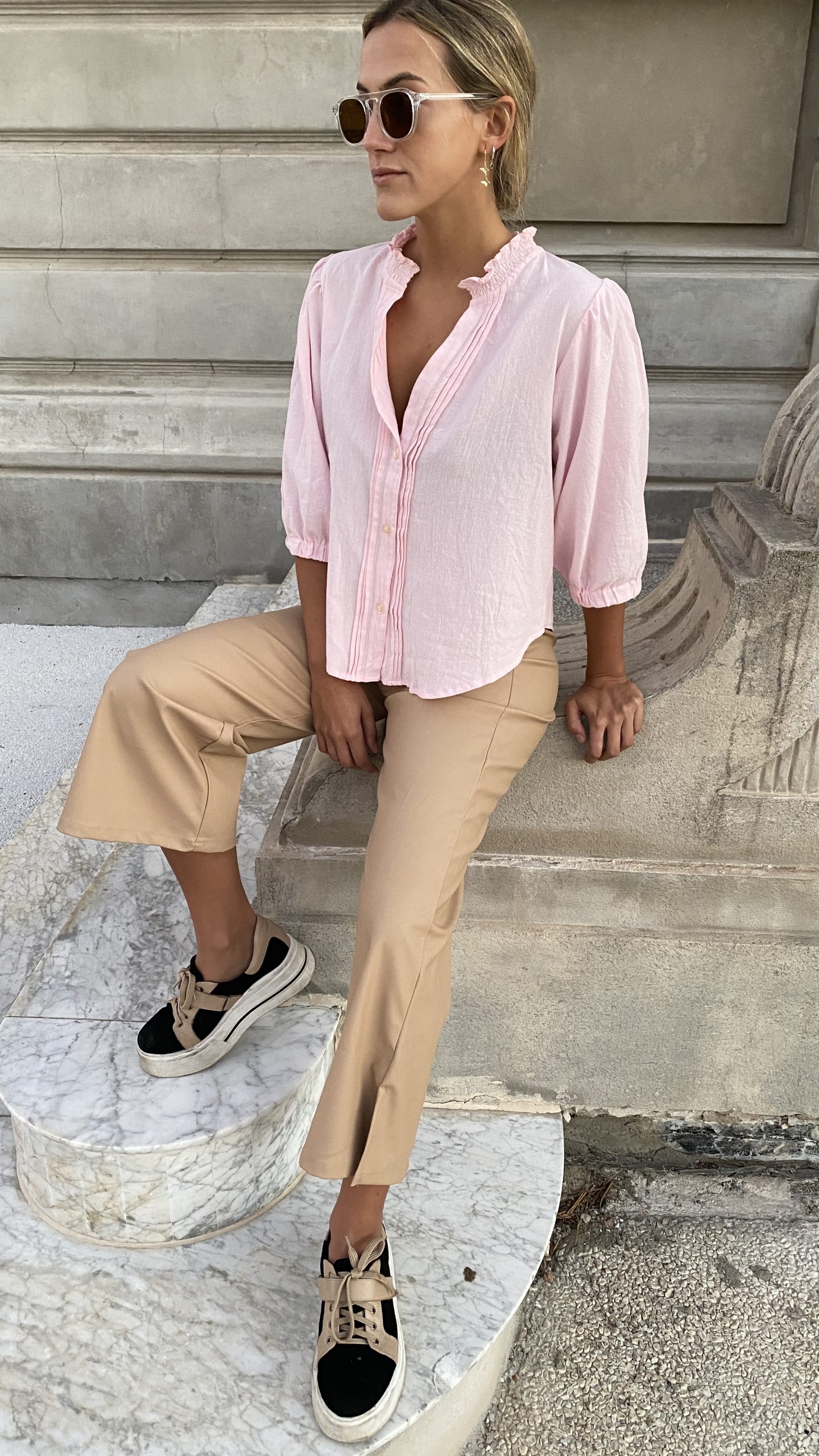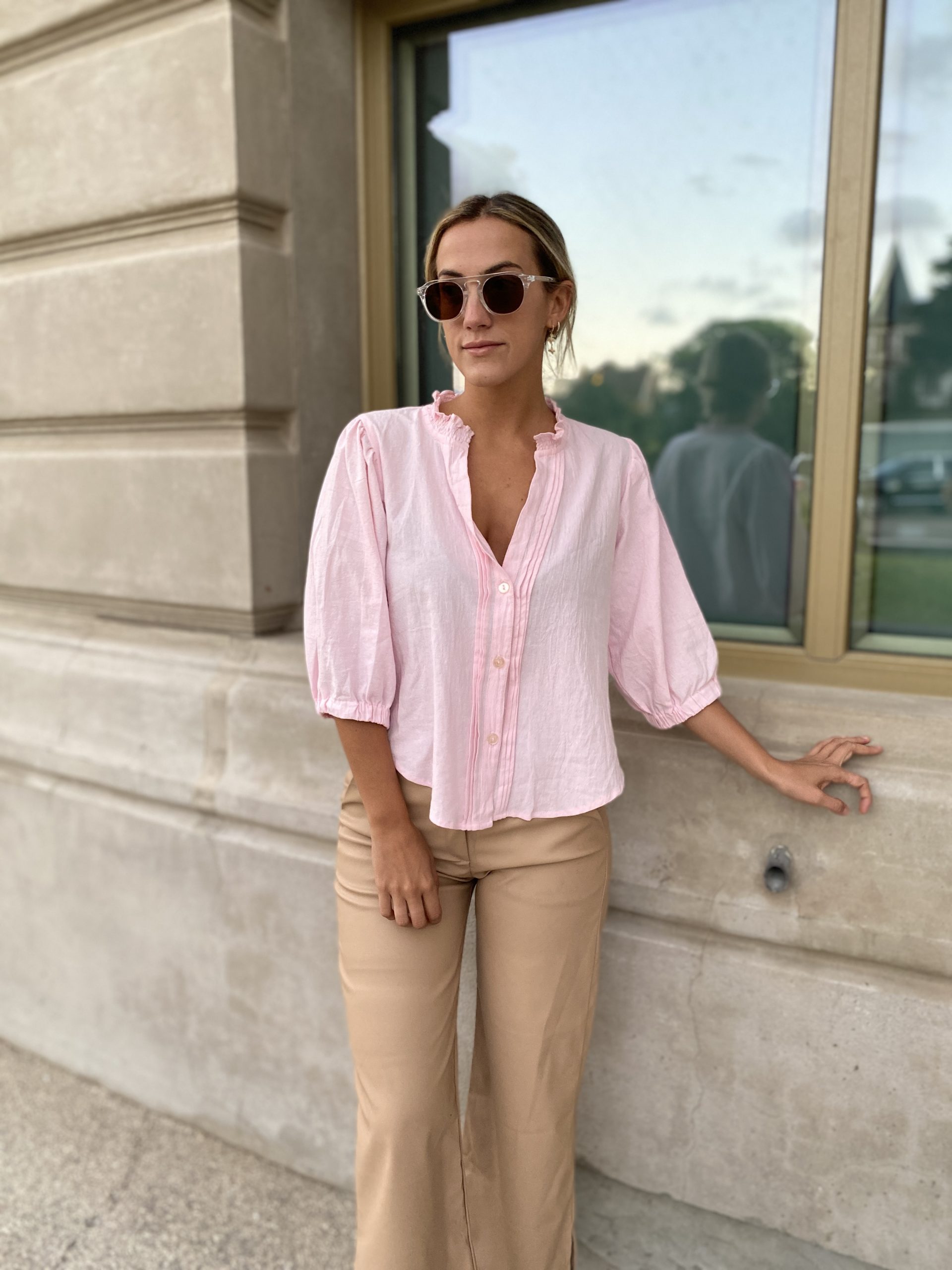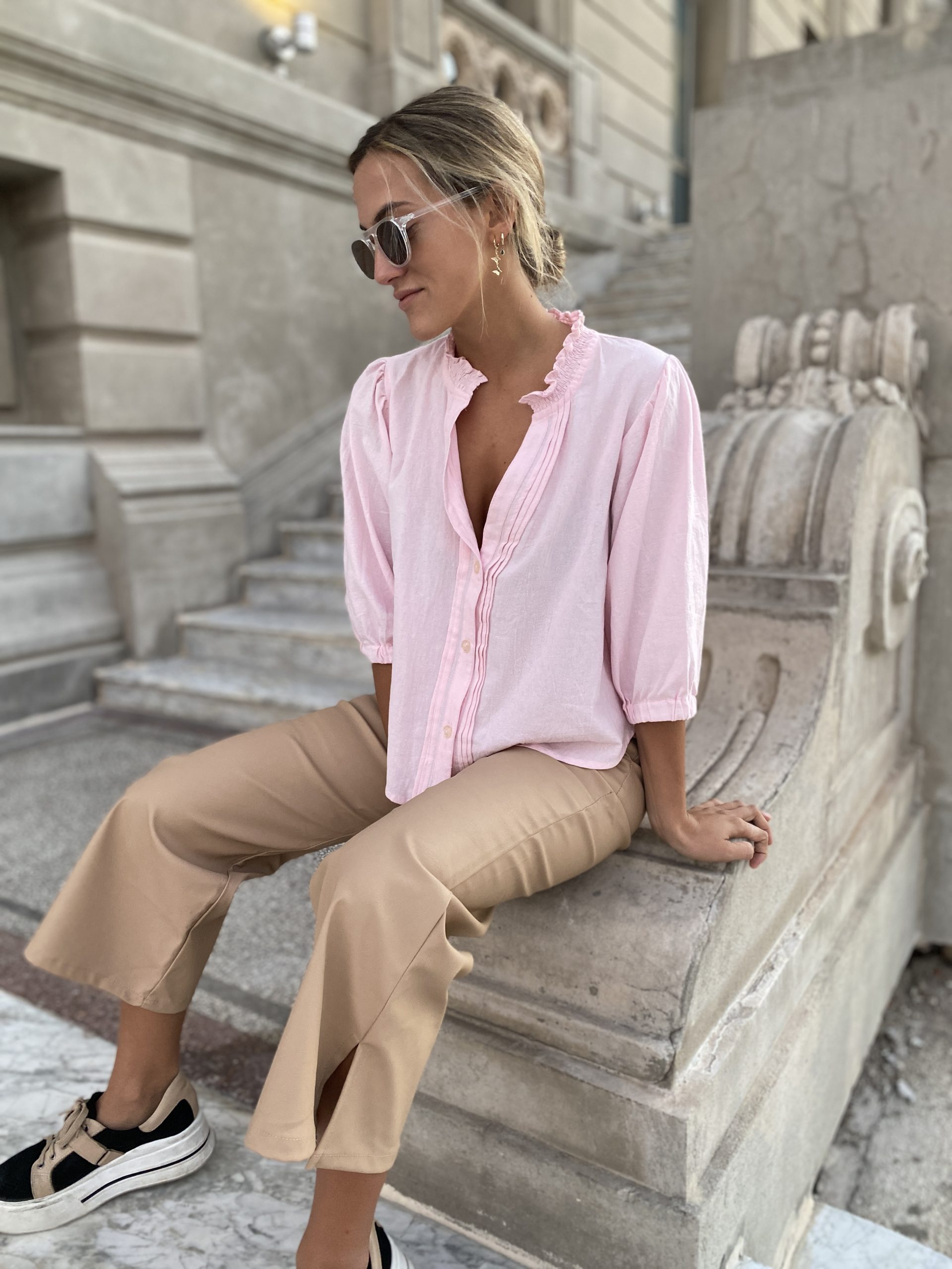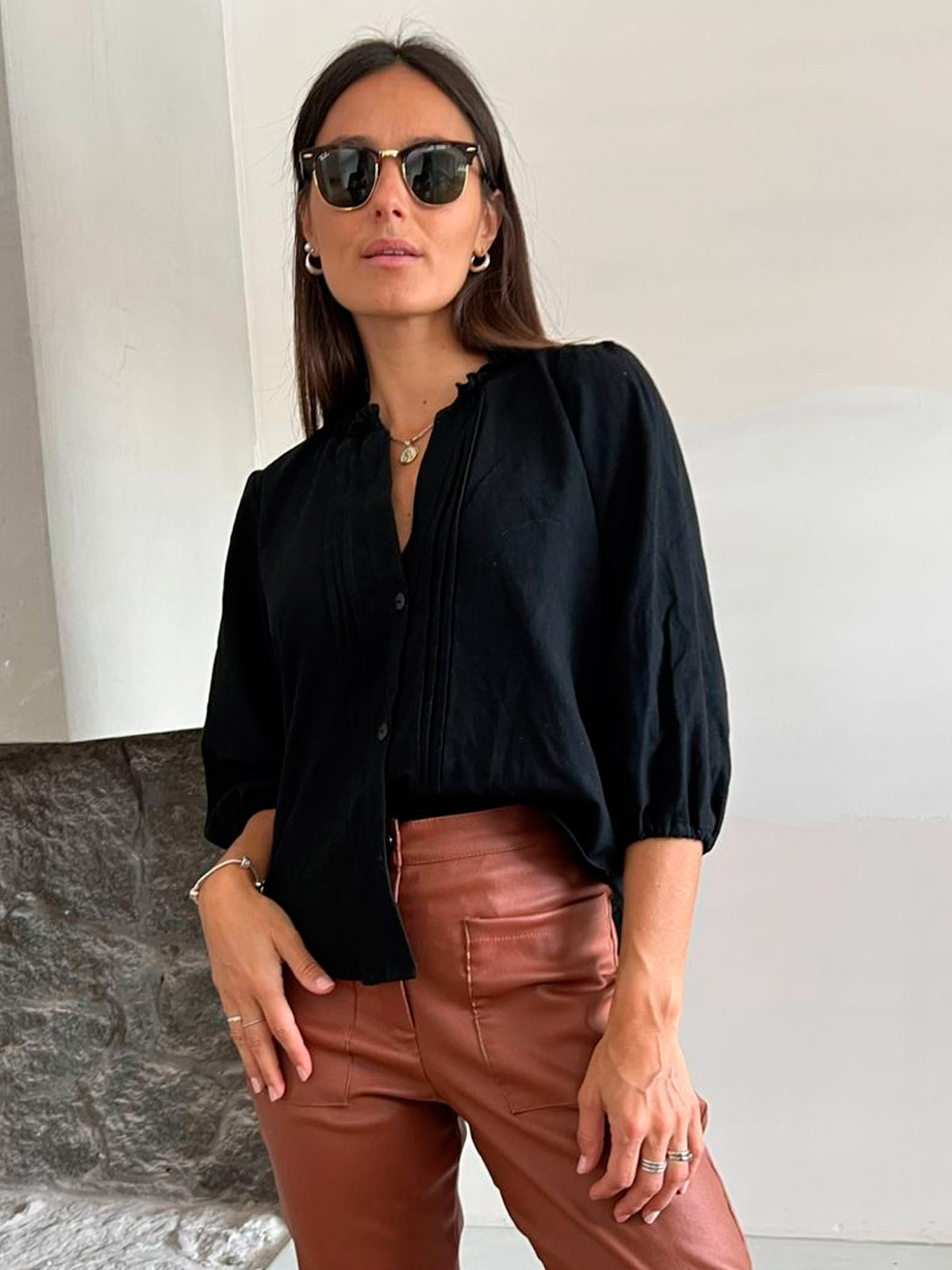 Camisa romántica, detalles en todos lados, con botones. En color rosa, negro y blanco.
